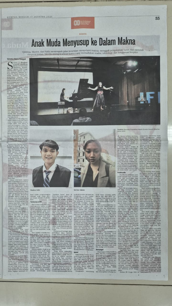 Artikel Harian Kompas, Minggu 17 Agustus 2025 Judul : Anak Muda Menyusup ke Dalam Makna (Qanissa, Sheren, dan Hafiz menempuh jalan Kesenian: menyelami