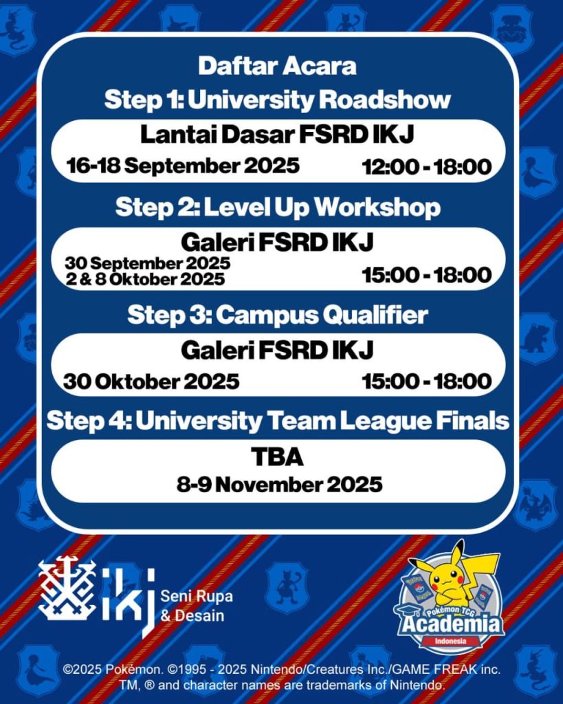 🎓Institut Kesenian Jakarta (IKJ) jadi kampus pertama yang membuka pintu menuju pengalaman seru bersama Pokémon Game Kartu Koleksi lewat rangkaian acara-acara yang keren! Di sini, kamu bukan cuma berkenalan dengan Pokémon Game Kartu koleksi tapi juga bisa bertanding sebagai perwakilan kampus bersama dengan teman-temanmu!