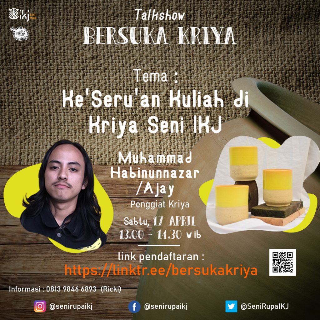 Pada tema episode ketiga Bersuka Kriya kali ini Muhammad Habibunnazar atau yang sering dipanggil Ajay merupakan seorang praktisi Kriya alumni Prodi Kriya Seni, FSR IKJ akan sharing pengalaman berkarya dan cerita-cerita selama Ajay kuliah di Kriya Seni IKJ.