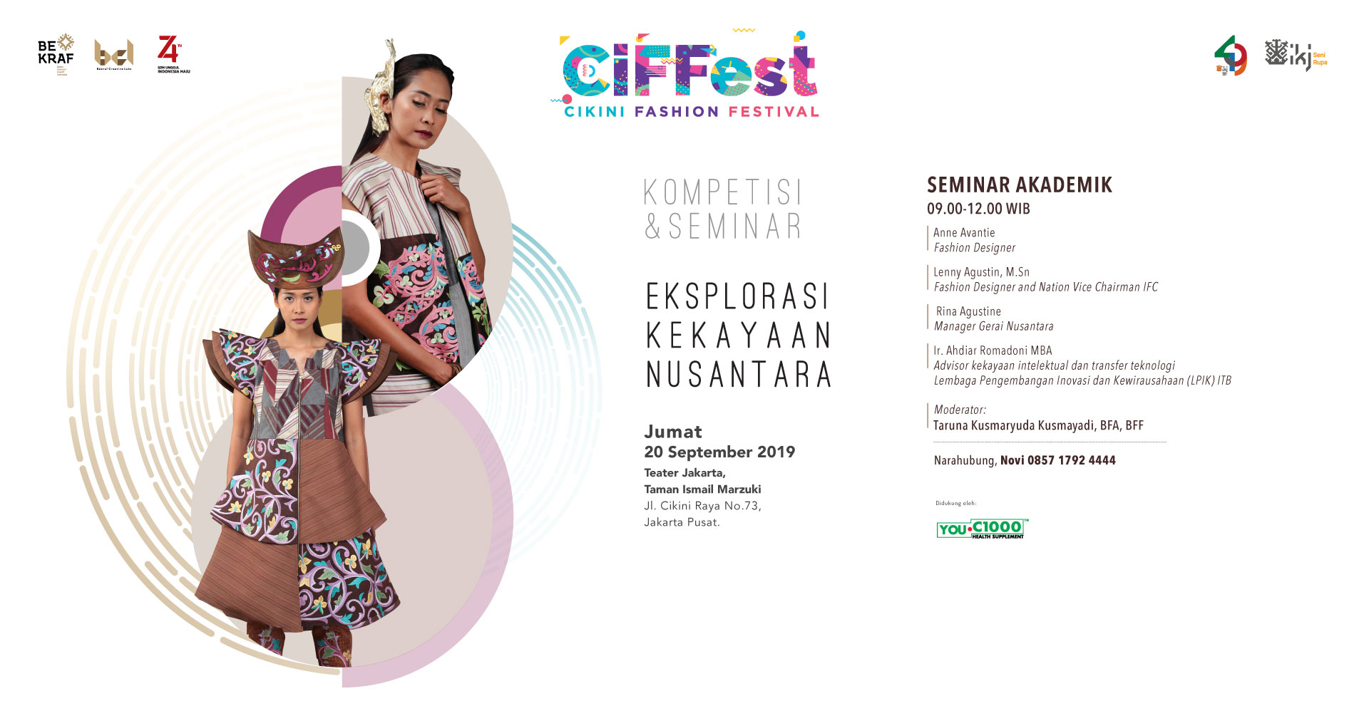 Haii…Fashionista Indonesia. CiFFest akan kembali hadir pada hari Jumat 20 September 2019 di Teater Jakarta Taman Ismail Marzuki. Mengangkat tema “Eksplorasi Budaya Nusantara”, CiFFest yang terselenggara atas kerjasama Fakultas Seni Rupa IKJ dan Bekraf Creatif Labs akan melaksanakan kegiatan seminar dan kompetisi.