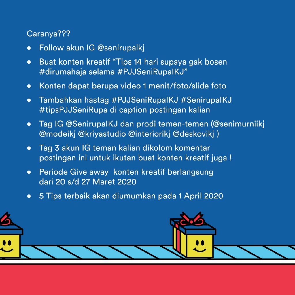 2. Buat konten kreatif “Tips 14 hari supaya gak bosen #dirumahaja selama #PJJSeniRupaIKJ”