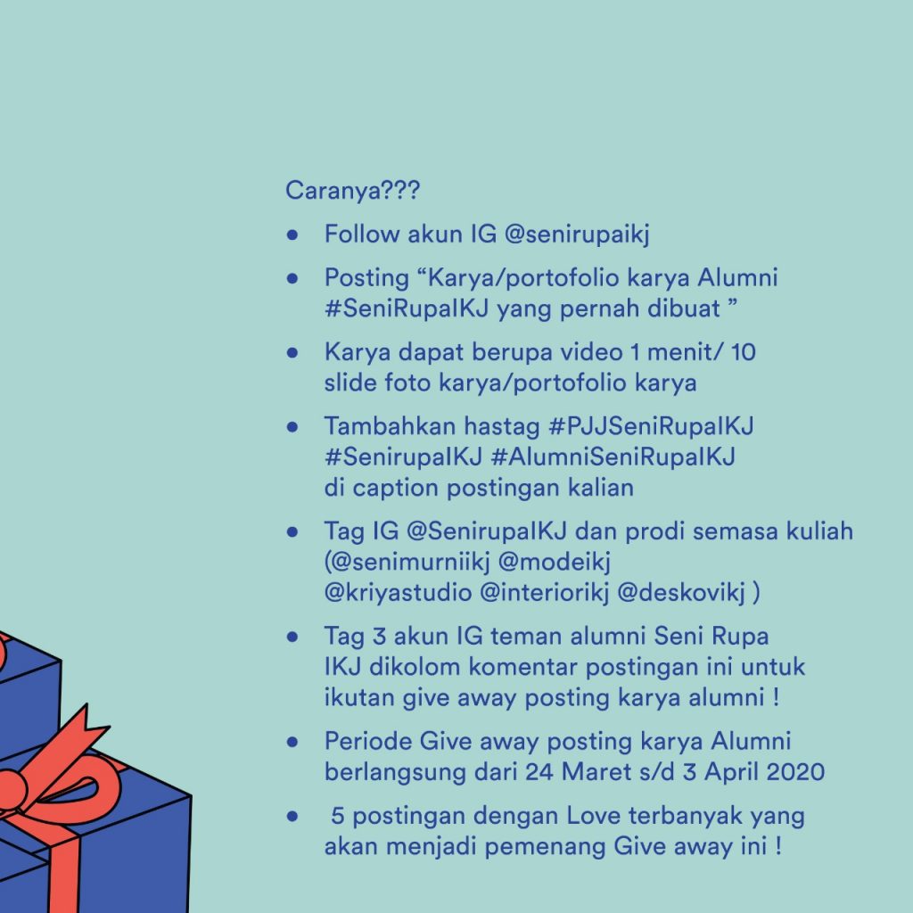 - Tag 3 akun IG teman alumni Seni Rupa IKJ dikolom komentar postingan ini untuk ikutan give away posting karya alumni !